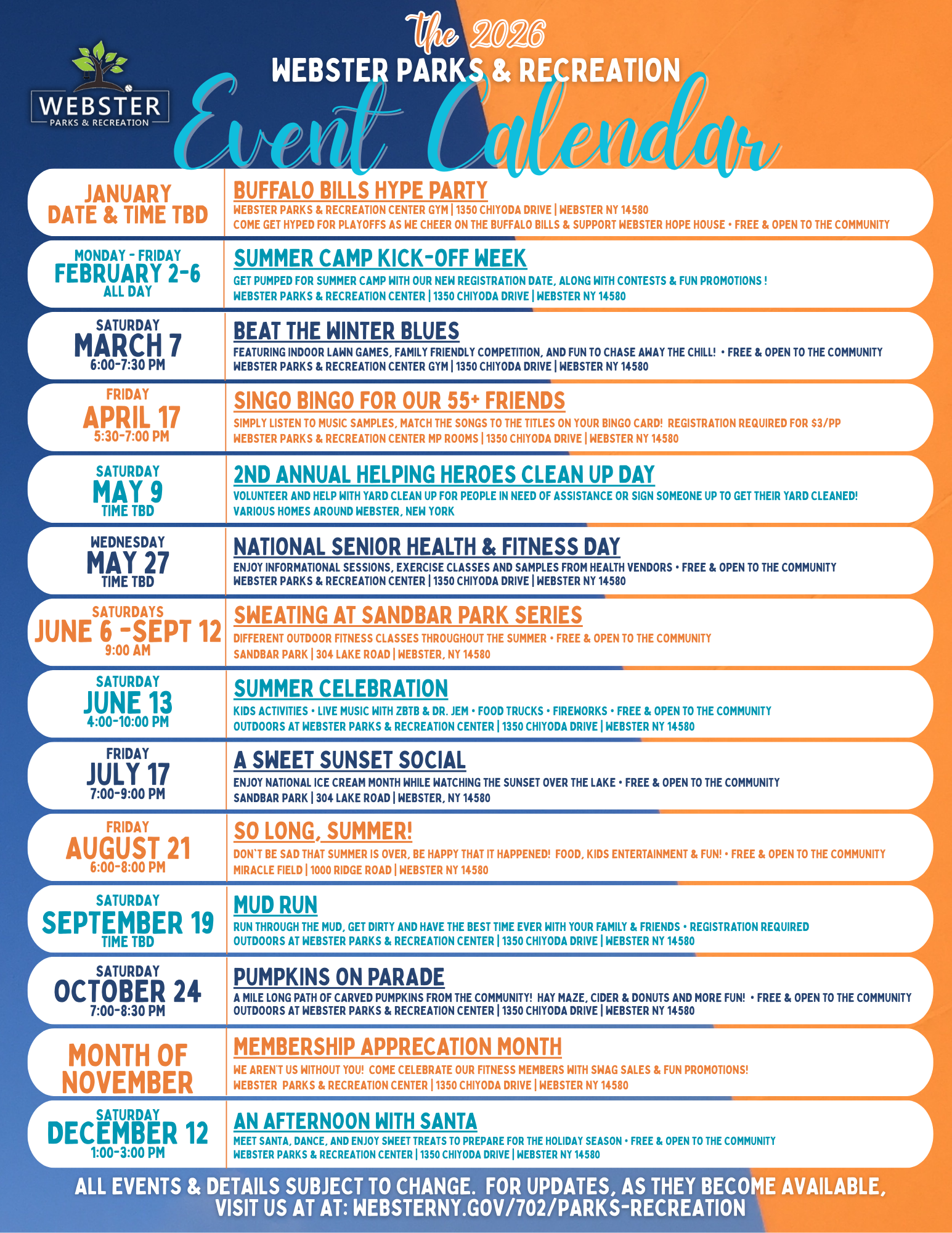 Webster Parks and Recreation offers a variety of family programs throughout the year and we invite you to join us! For more information, click on the flyers below as some may require http://www.ci.webster.ny.us/104/parks-recreation registration and be sure to check back frequently for updates. We hope to see you!