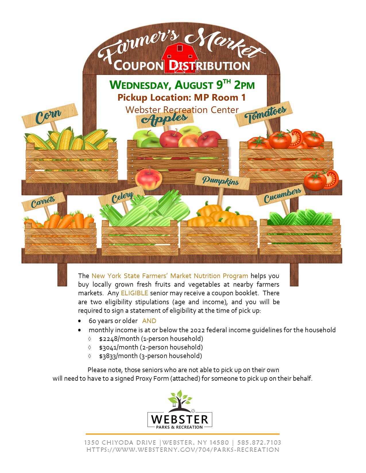 The New York State Farmers Market Nutrition Program helps you buy locally grown fresh fruits and vegetables at nearby farmers markets. Any ELIGIBLE senior may receive a coupon booklet. There are two eligibility stipulations, and you will be required to sign a statement of eligibility at the time of pick up: